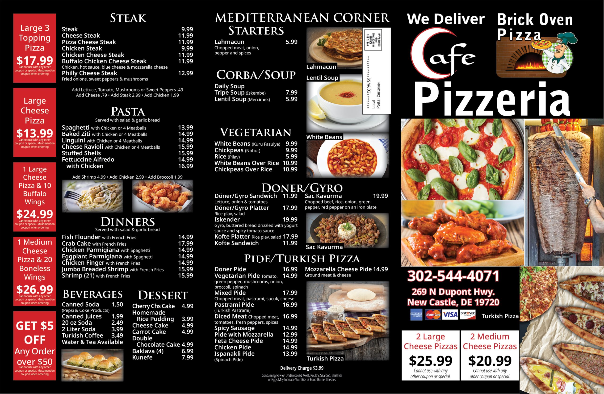 Menu Click to Enlarge Order Through 3rd party Restaurant Hours Monday – Saturday: 11am – 9pm Sunday: Closed Order Now Contact Location 269 N Dupont Hwy. New Castle, DE 19720 Phone 302-544-4071